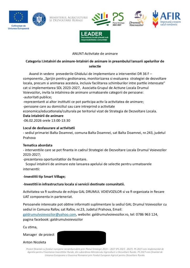 Anunț întâlnire de animare în Comuna Balta Doamnei, Prahova