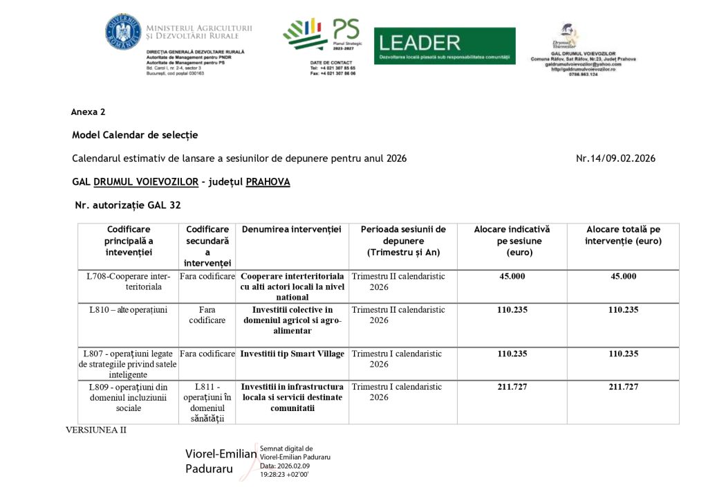 Calendar Estimativ Lansare Apeluri de Selectie – postat in data de 09.02.2026